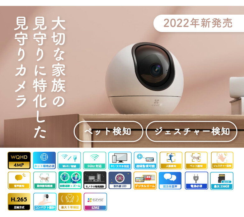 防犯カメラ ペット カメラ 留守 ワイヤレス wifi 無線 家庭用 監視カメラ Wi-Fi 留守番 見守りカメラ 屋内 室内 アレクサ対応 動体検知 通話 追尾 子供 犬 猫 介護 音声 赤ちゃん ベビーモニター ネットワークカメラ 小型 スマホ 遠隔監視 映像共有 高画質 EZVIZ C6 C6W