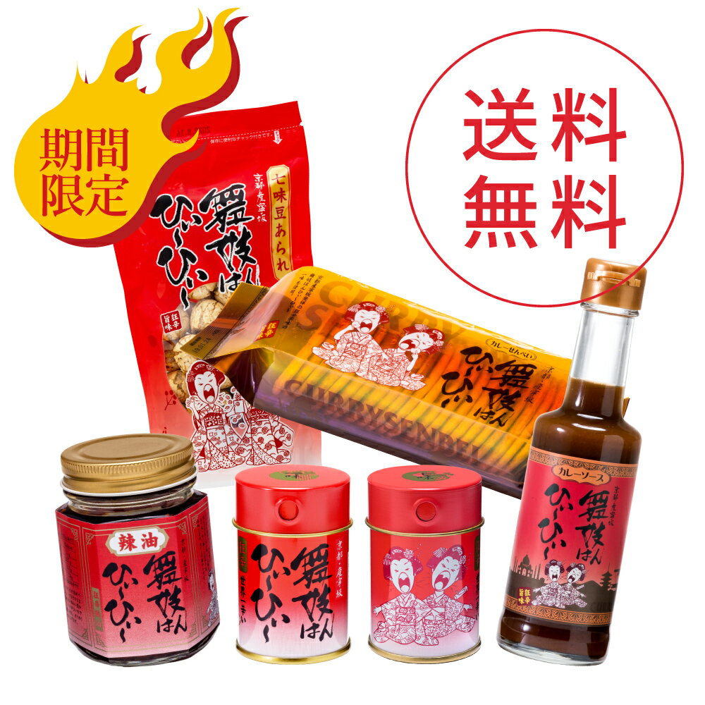 激辛を超えた狂辛【≪送料無料≫舞妓はんひぃ〜ひぃ〜BOX-S:2022】夏の狂辛特集期間限定商品 狂辛の七味・一味・ラー油とカレーソースにカレーせんべいと豆あられも入ったセット。京都 七味とうがらし専門店 おちゃのこさいさい